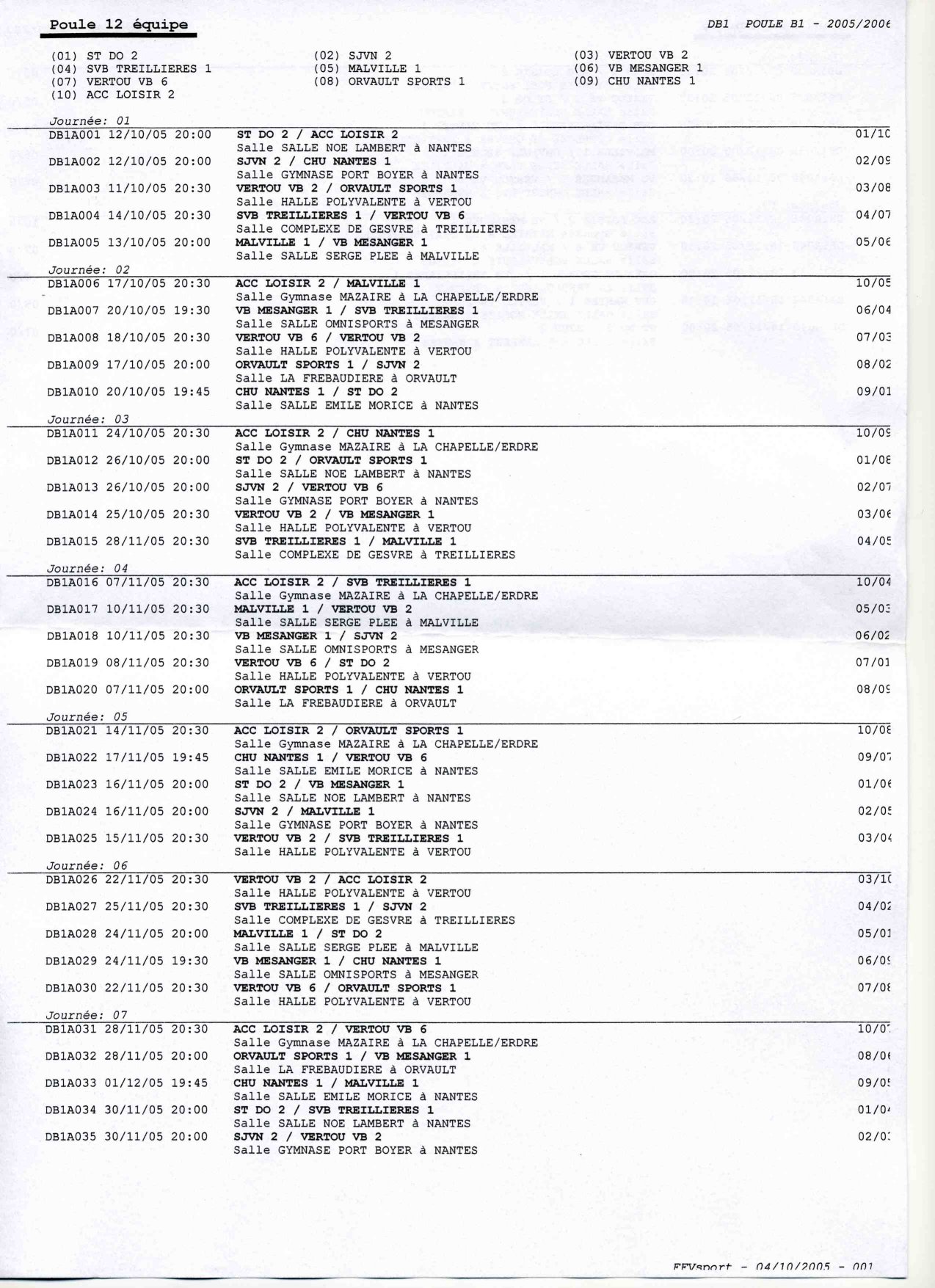 06/10/2005 - Equipe 1 : Planning 1ère partie de la saison